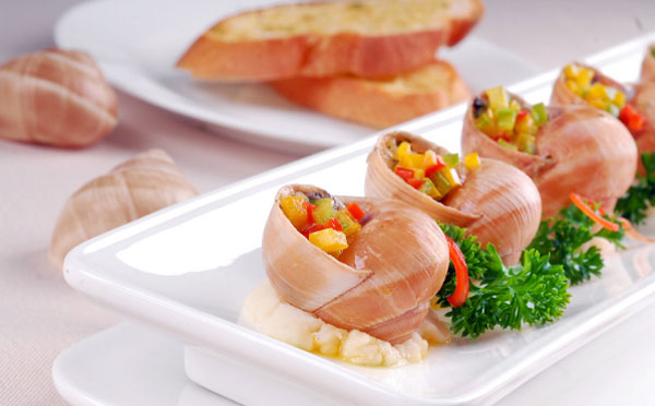 培根白菌焗元贝、法式焗蜗牛、法式香煎鹅肝、香煎龙利鱼配黄油汁等。